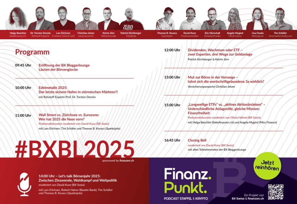 Natürlich bietet der Börsentag noch viele weitere spannende Vorträge: Von Edelmetallen als sicherem Hafen, über Vorsorge & 3a bis hin zu Marktausblicken auf 2025.