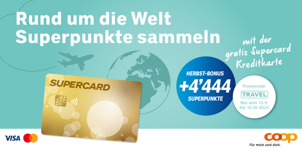 Nutze den Promocode 2025 “liebefinanzen” und erhalte 1500 Superpunkte gratis bei deinem Kreditkartenantrag. Der Coop Supercard Kreditkarte Promotions Code ist für die Supercard Visa und die Supercard Mastercard gültig.