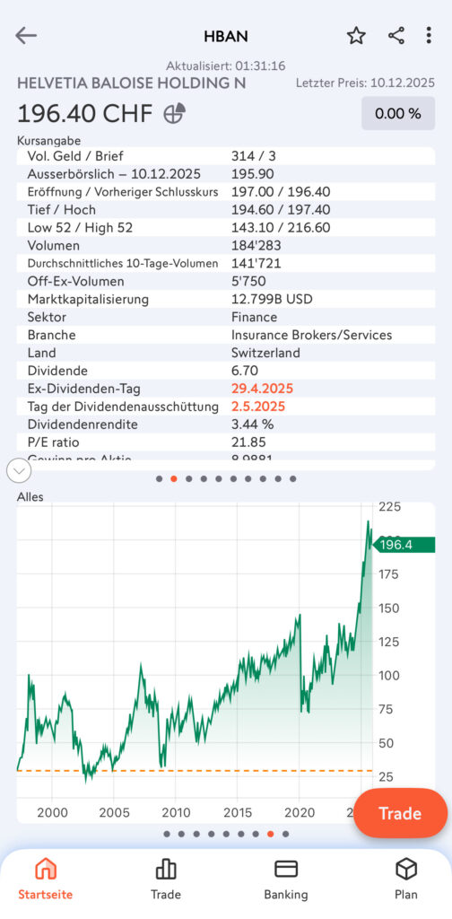 ich hatte 58 Baloise Aktien und nun 58.69 HBAN, bin mal gespannt wie lange die fraktionierten Anteile gesperrt sind, ich möchte wieder gerade Zahlen. Auf die Dividende bin ich auch gespannt, hoffe natürlich dass sie höher ausfallen wird, zumal mir meine Haftpflichtversicherung bei der Helvetia einen happigen Aufschlag von 25% für die Prämie 2026 mitgeteilt hat.