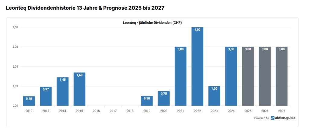 Leonteq ist ein Beispiel von einer Aktie mit extrem hoher Dividendenrendite (momentan 21,90!%), was aber nichts Gutes bedeutet. Es gab unregelmässige Zahlungen, Ausfälle und Kürzungen.