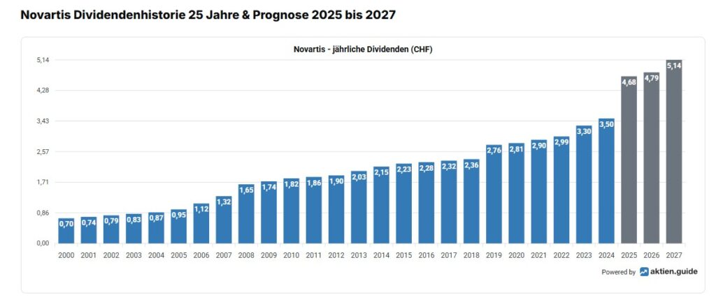 Dividendenhistorie der Novartis Aktie mit kontinuierlicher Steigerung der Dividende.